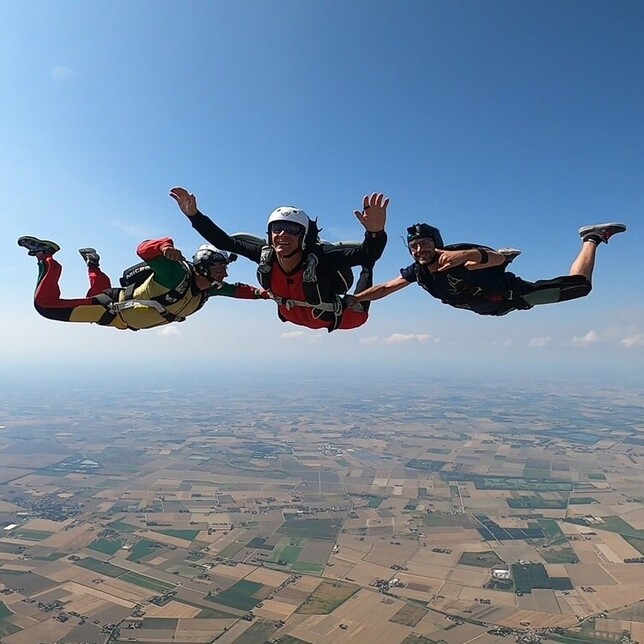 Primo lancio con due istruttori. Impari la posizione stabile e l'apertura del paracadute.
